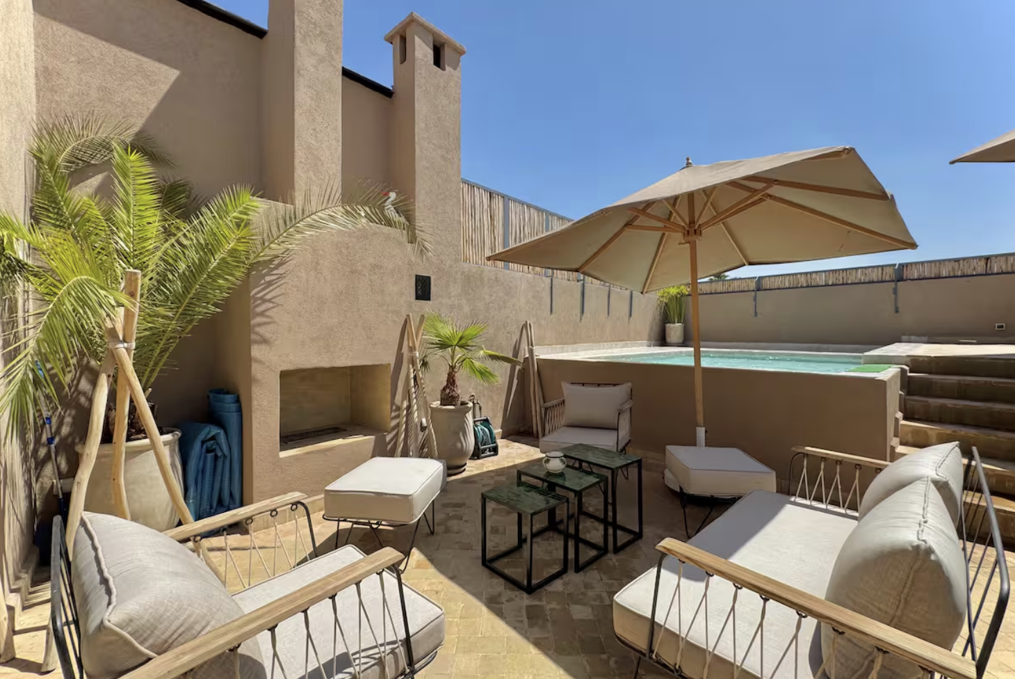 This beautifully designed 6-bedroom riad features ensuite bedrooms, daily breakfast and nourishing meals prepared by our private chef, a serene courtyard with a fountain and citrus trees, and inviting lounge spaces to relax and connect. The rooftop is a highlight, with a pool, sun loungers, and dining spaces for our group meals, all set against sweeping views over the medina toward the Atlas Mountains, the perfect setting to unwind, reset, and flow through our daily yoga and Pilates sessions.
